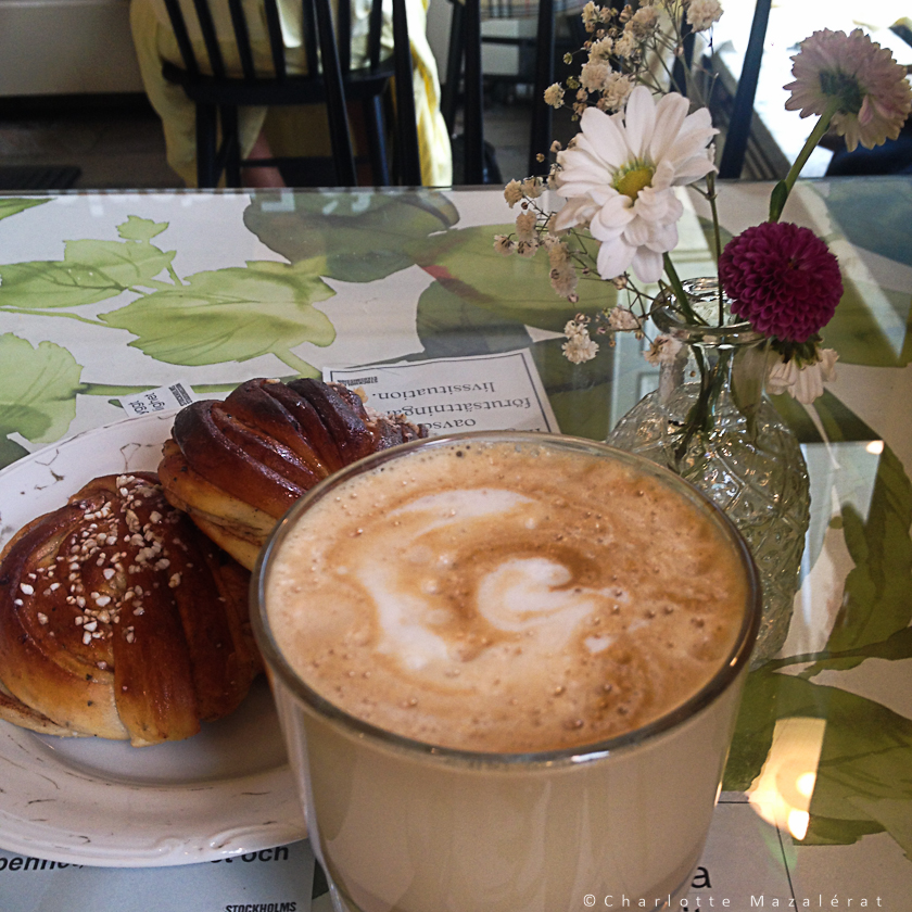 L’accueil était sympathique, chaleureux. La salle de taille moyenne avait une grande hauteur sous plafond, agrémentée de lampes vertes suspendues. Sur chaque table était posé un petit vase différent avec des fleurs fraîches. Le lieu était sans prétention mais on pouvait y rester le temps de savourer un très bon café avec de délicieuses et savoureuses petites brioches à la cardamome faites maison. Ces brioches moelleuses étaient chaque fois bienvenues au moment de « fika », comme disent les suédois, autrement dit : « prendre le temps de faire une pause ».