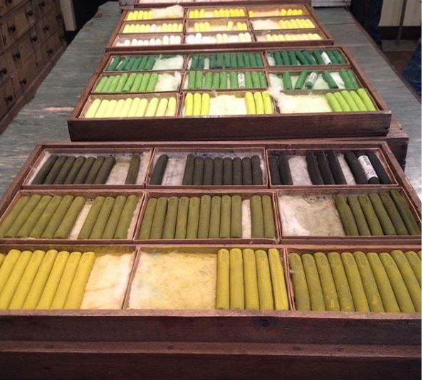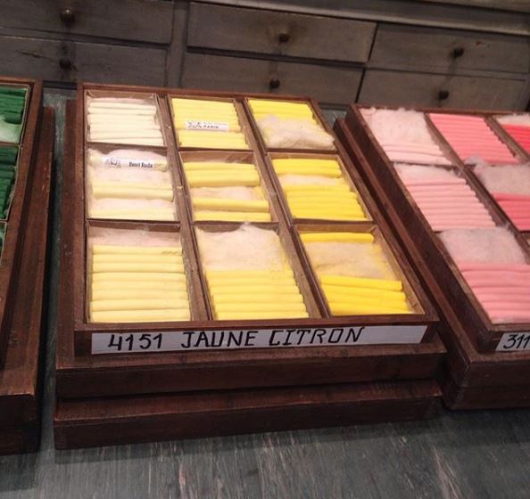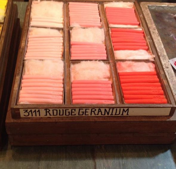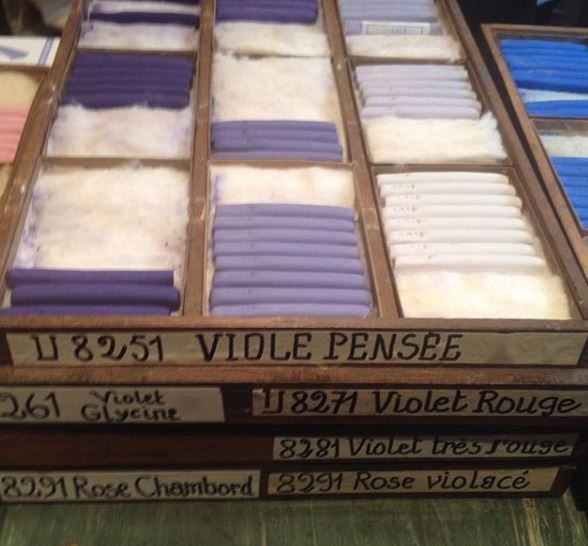 Ce n’est pas là que sont fabriqués les bâtonnets, tous plus beaux les uns que les autres. C’est là qu’est le magasin. Des tiroirs de bois, des coffrets déclinent par teinte distincte une profusion de couleurs aux noms évocateurs. La collection compte aujourd’hui 1200 teintes.